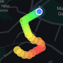 The device automatically captures radiation levels at user-defined intervals, creating a track composed of colored points on the map. The color of the track represents the radiation level at the corresponding location: shades of red signify higher levels, yellow indicates moderate levels, and blue and green show lower levels. This color-coding is as straightforward as a traffic light system.