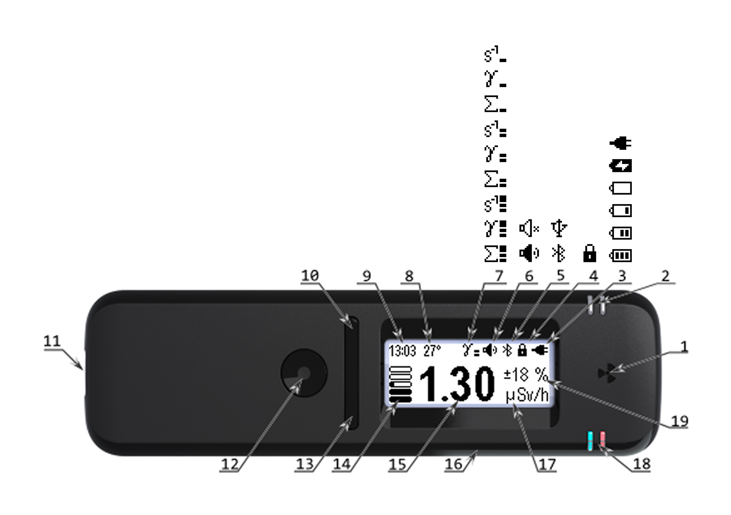 Designelemente, Steuerungen und Anzeigen tragbarer Strahlungsdetektor Radiacode-10X Serie