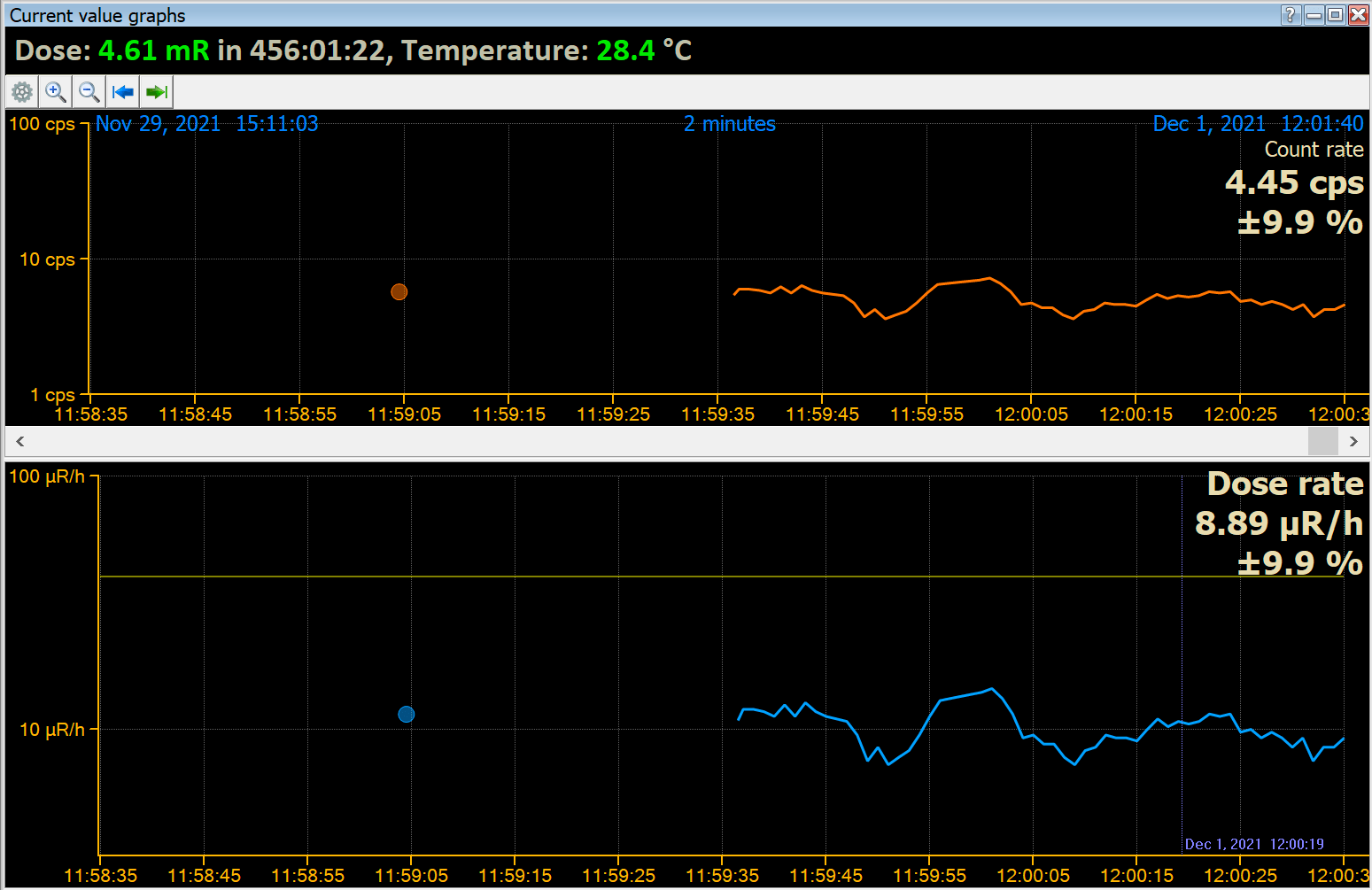 Die Grafiken für Impulszählrate und Dosisrate werden in diesem Fenster angezeigt. Die Daten für die Anzeige stammen aus der Datenbank und werden mit Echtzeitdaten vom Gerät ergänzt. Die Y-Achse der Anzeige ist logarithmisch skaliert.