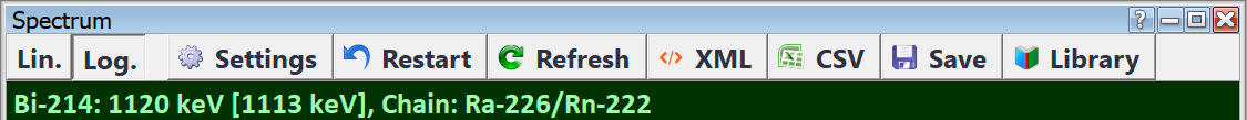 Der Name des Isotops, seine entsprechende Energie, die Energie an der Cursorlinie im Spektrumdiagramm und der Name der Zerfallskette für das Isotop werden in eckigen Klammern angezeigt.