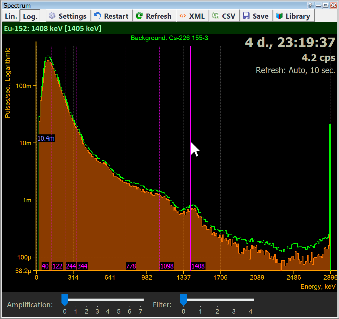 Bei der Verwendung von Spektrum und Hintergrund von verschiedenen Radiacode-Geräten beachten Sie, dass unterschiedliche Geräte unterschiedliche Kalibrierungsfaktoren haben. Beim Überlagern von Spektraldiagrammen vergleicht die Anwendung diese Kanal für Kanal (der erste Kanal mit dem ersten Kanal, der zweite Kanal mit dem zweiten Kanal, usw.). Verschiedene Geräte haben unterschiedliche Emissionsenergien, die den gleichen Spektralkanälen entsprechen. Daher treten Unterschiede in den Positionen der Peaks auf, die der gleichen Emissionsenergie entsprechen, wenn Diagramme von verschiedenen Geräten überlagert werden.