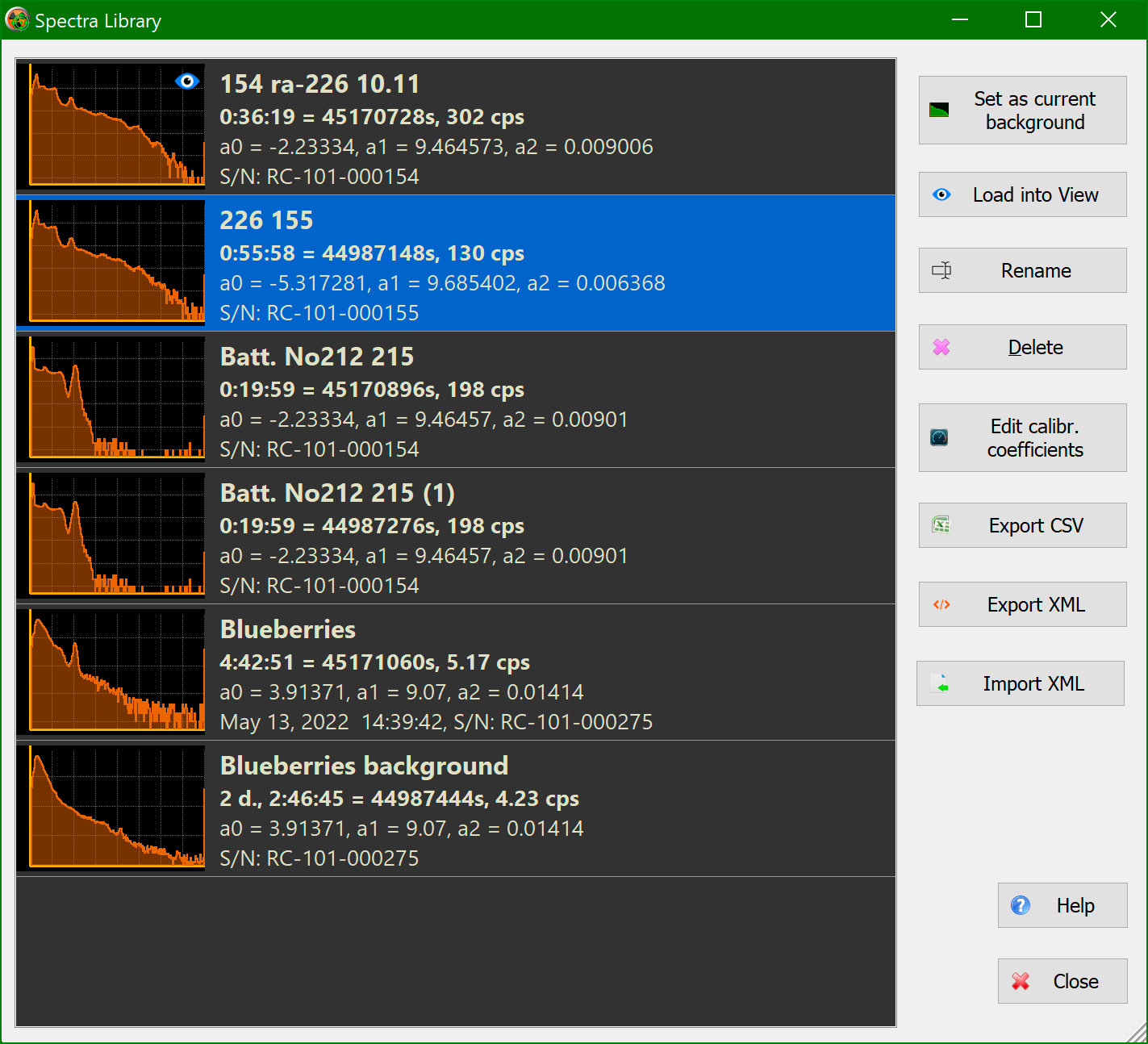 - XML-Import: laden Sie das Spektrum/Hintergrund aus einer XML-Datei in die Bibliothek, die zuvor beim Exportieren aus der RadiaCode-Anwendung oder der RadiaCode-App auf einem Smartphone gespeichert wurde.