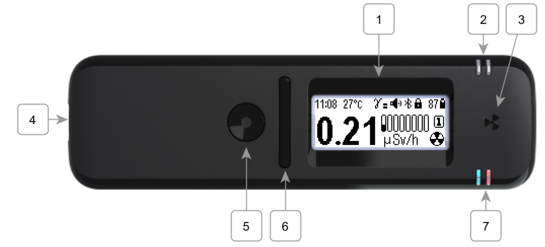 - LED indicators: charging (blue); photon detection (green in normal conditions, red when an alarm threshold is exceeded)