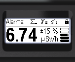 If any of the alarm thresholds for dose rate, count rate, or accumulated dose are exceeded, the corresponding alarm will be activated. To stop the alarm at any level, you need to confirm by briefly pressing the round button to acknowledge the alarm. The instrument will continue to display the exceeded level with a flashing icon of the appropriate type. To terminate an alarm based on the accumulated dose level, you must reset it to zero or change the corresponding alarm threshold.