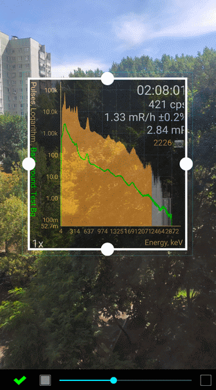 You can adjust the size and position of the overlay by dragging the circles on the frame. The slider below the image controls the transparency of the overlay, and touching the squares next to the slider sets it to full opacity or full transparency. The settings for the position and transparency of the overlay are saved separately for each type of overlay and smartphone screen orientation.