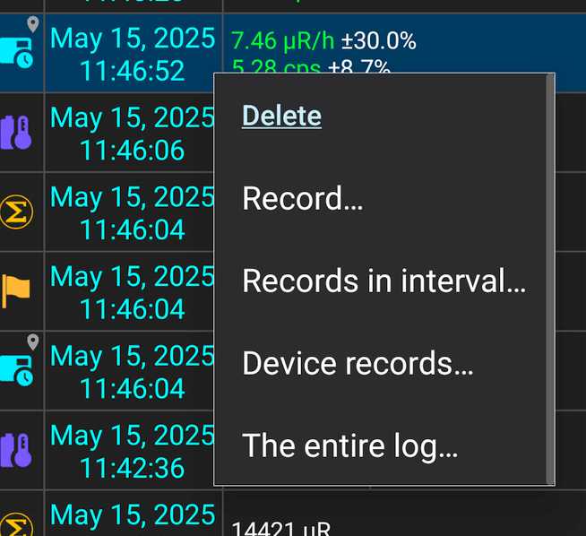 The "Record..." option deletes the record selected by tapping (it is highlighted with a blue background).