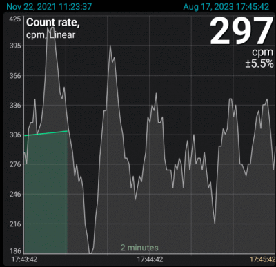 At the top right, the current count rate is displayed—the number of emission pulses recorded by the device's sensor per second or per minute, depending on the selected settings.