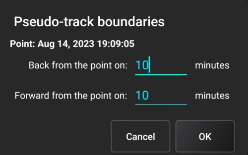 To create a pseudo-track, choose the desired point on the graph or the desired entry in the log and press and hold on the screen. A dropdown menu will appear. Select the “Show on the map” option (this will only be available if the aforementioned option was enabled during the measurement and the application received location data from the system). You will then be prompted to select time limits for creating a pseudo-track: