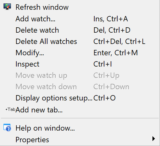 Delete All Watches | Removes all objects from the window. |