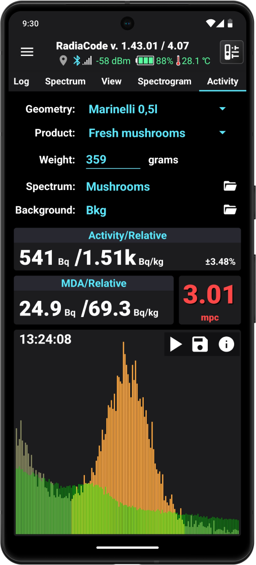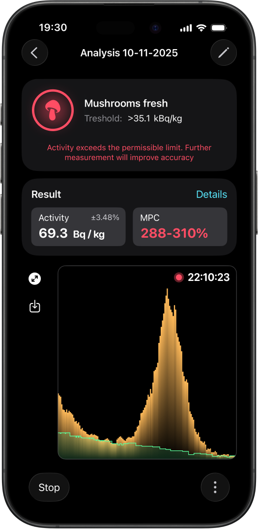 Radiacode includes a specialized mode for detecting Cesium-137 in food products. Cesium-137, a synthetic isotope produced by nuclear tests and accidents, has dispersed worldwide. It does not occur naturally and can be mistakenly absorbed by living organisms.