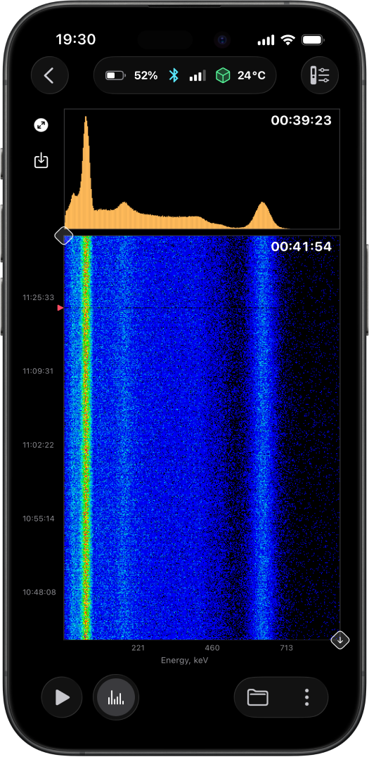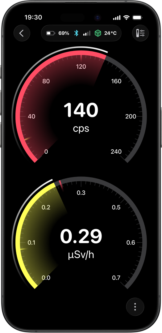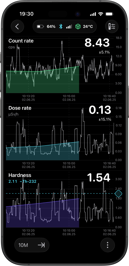 The Radiacode mobile application features a real-time dashboard that consolidates key data from all sections, enabling quick monitoring of essential information at a glance. Interactive charts in a dedicated section track radiation levels over time, providing detailed analysis and insights for well-informed decision-making.