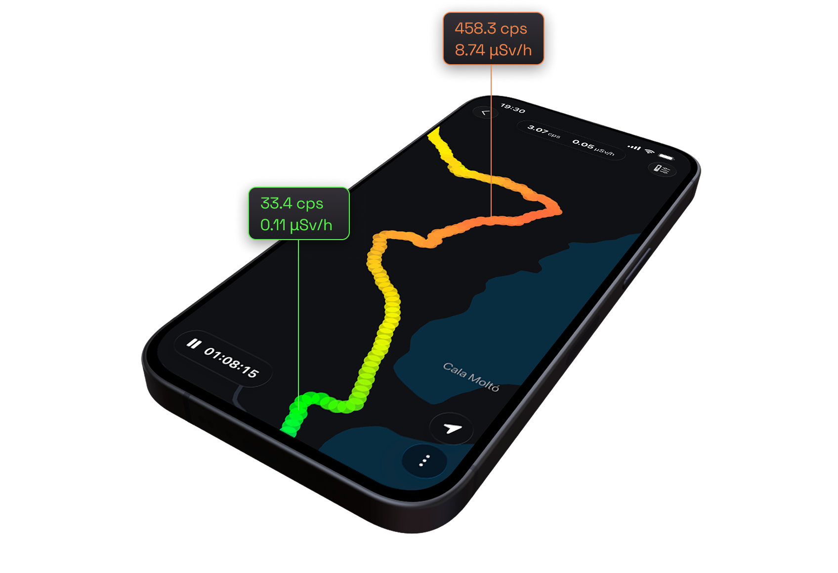 The Radiation Mapping function in Radiacode records radiation measurements on Google Maps, creating a color-coded track that indicates radiation level.