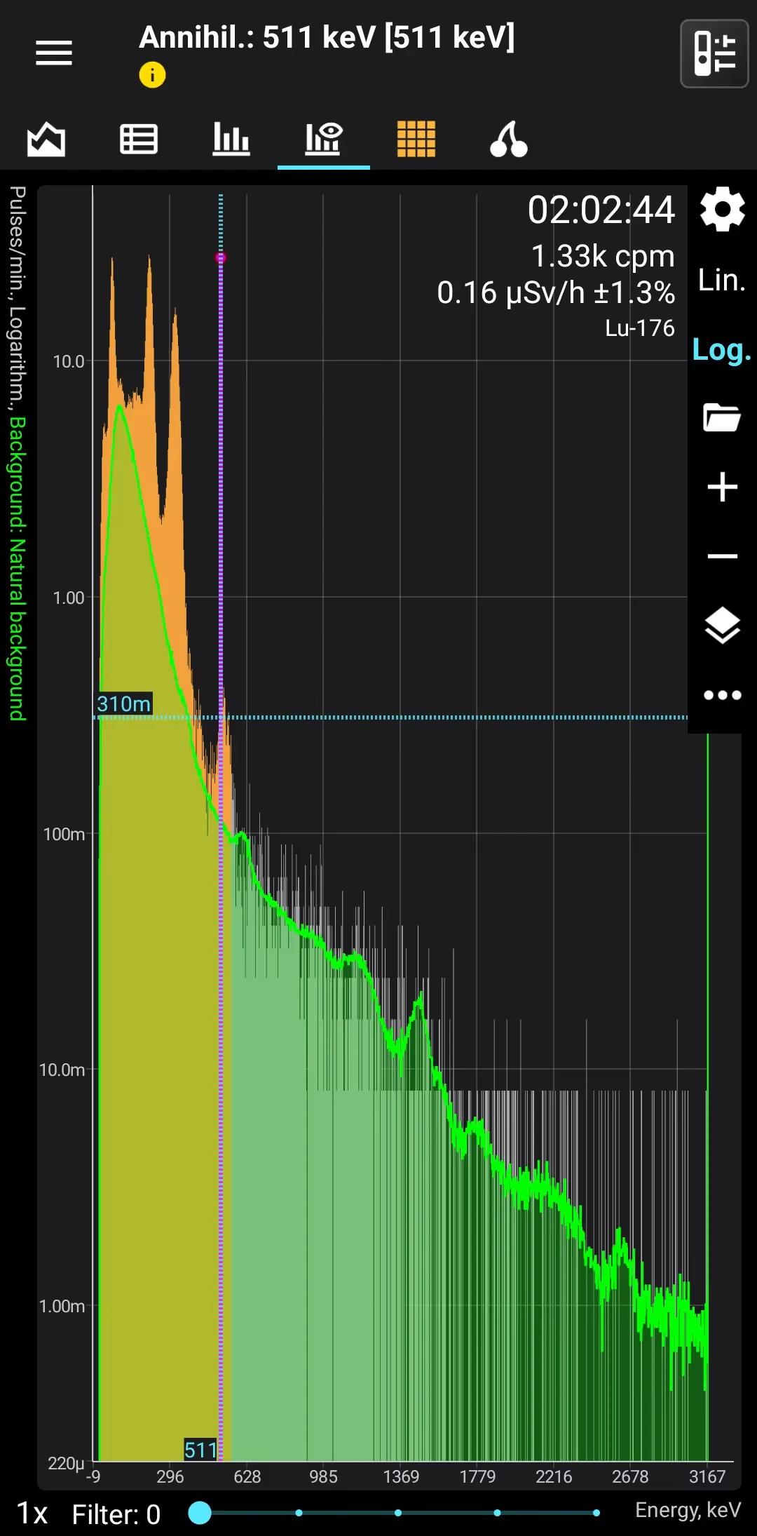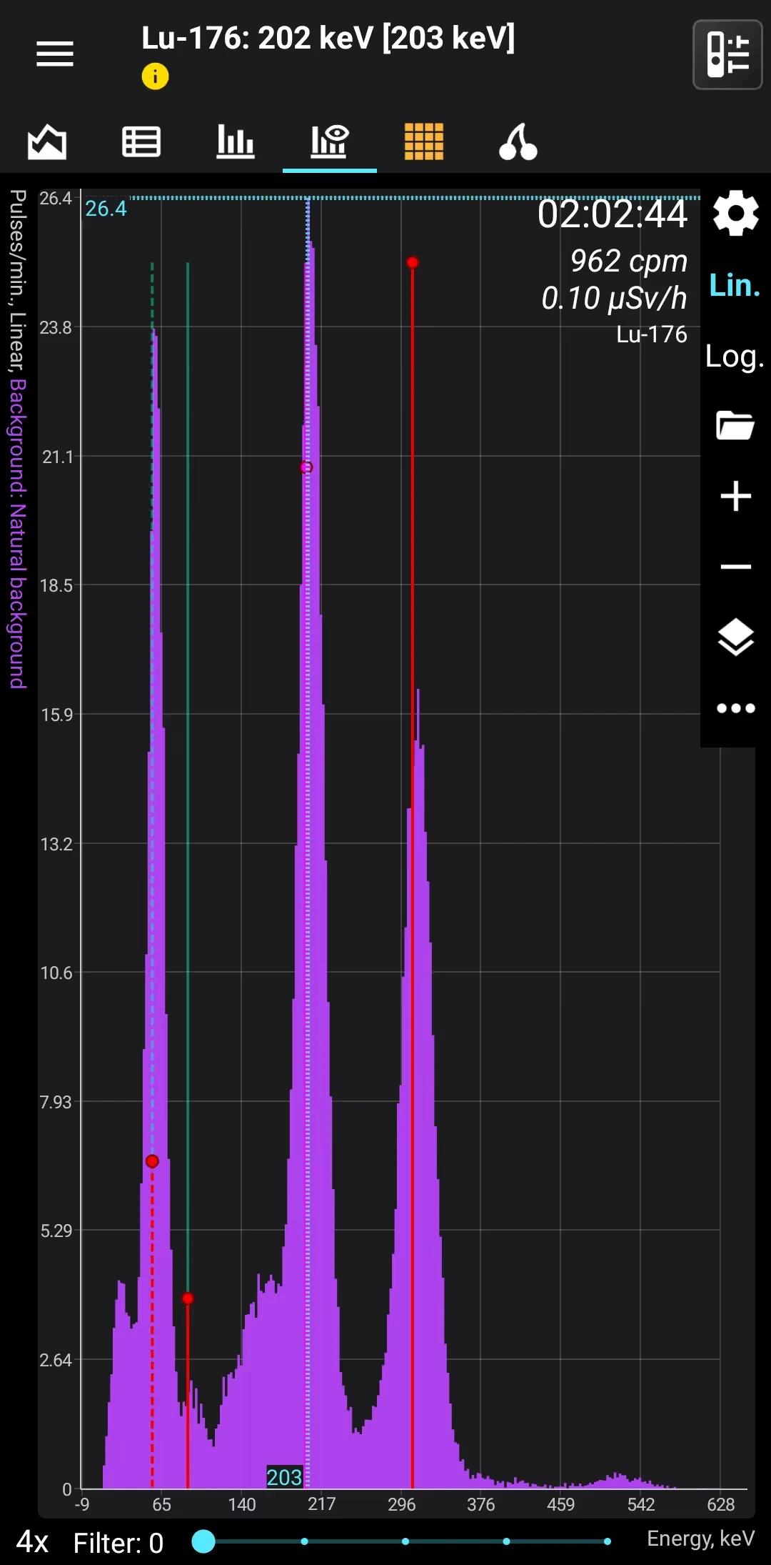 Lutetium-176 (Lu-176) is a naturally occurring isotope of lutetium, with a natural abundance of approximately 2.6%. It is a radioactive isotope with a very long half-life of about 37.8 billion years, making it nearly stable over geological timescales. Lu-176 undergoes beta decay to hafnium-176 (Hf-176), emitting beta particles and low-energy gamma radiation in the process. Its gamma emissions include characteristic lines at energies such as 88 keV and 202 keV, making it highly detectable and useful in gamma spectrometry.