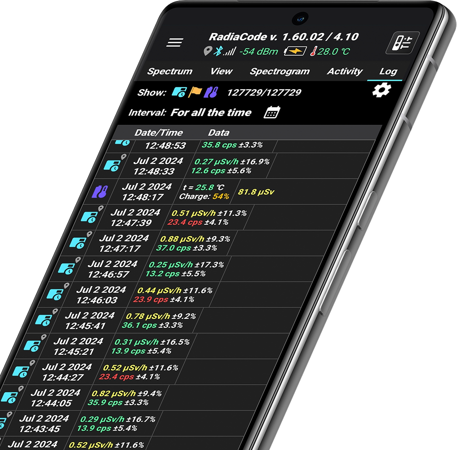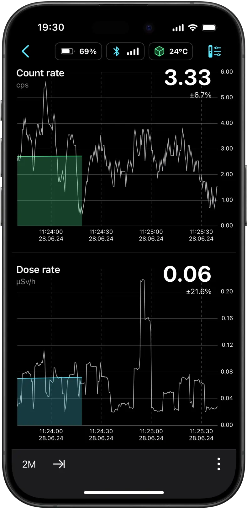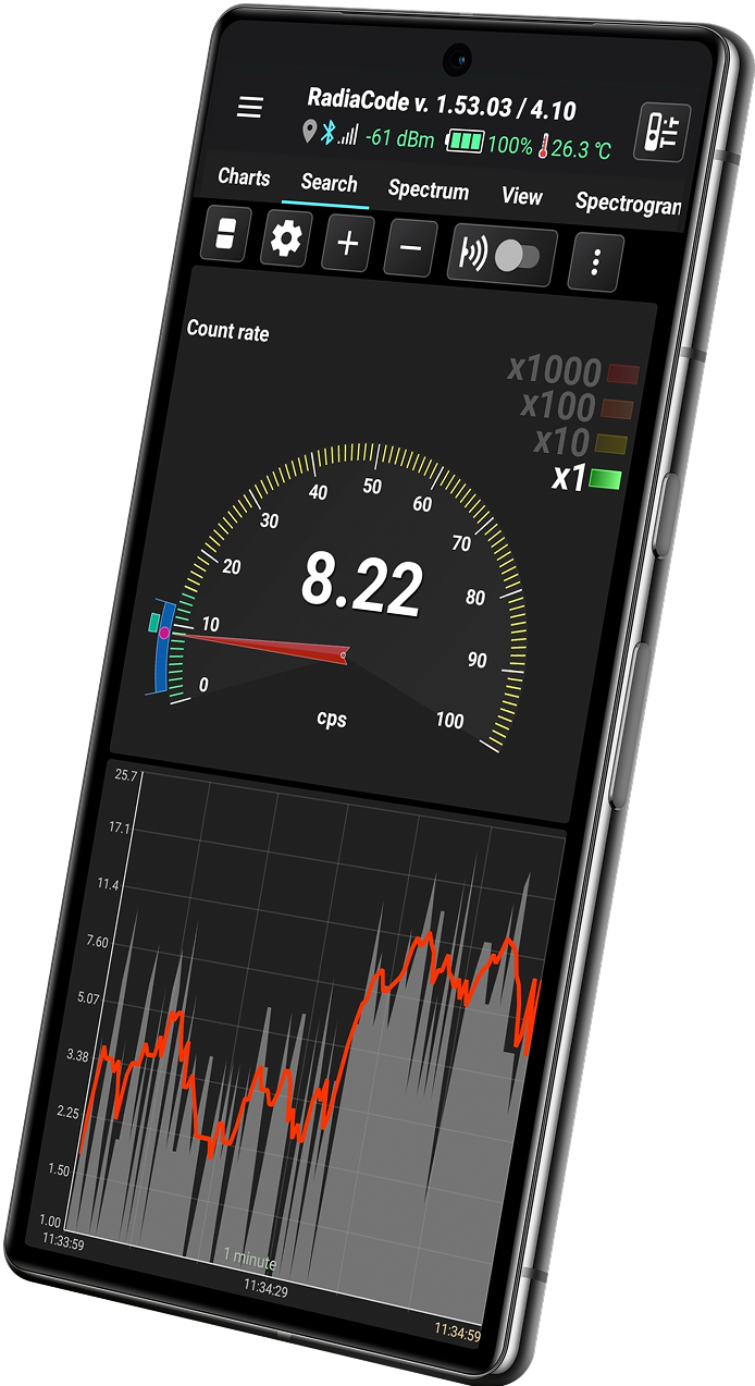 The Radiacode mobile application features a real-time dashboard that consolidates key data from all sections, enabling quick monitoring of essential information at a glance. Interactive charts in a dedicated section track radiation levels over time, providing detailed analysis and insights for well-informed decision-making.