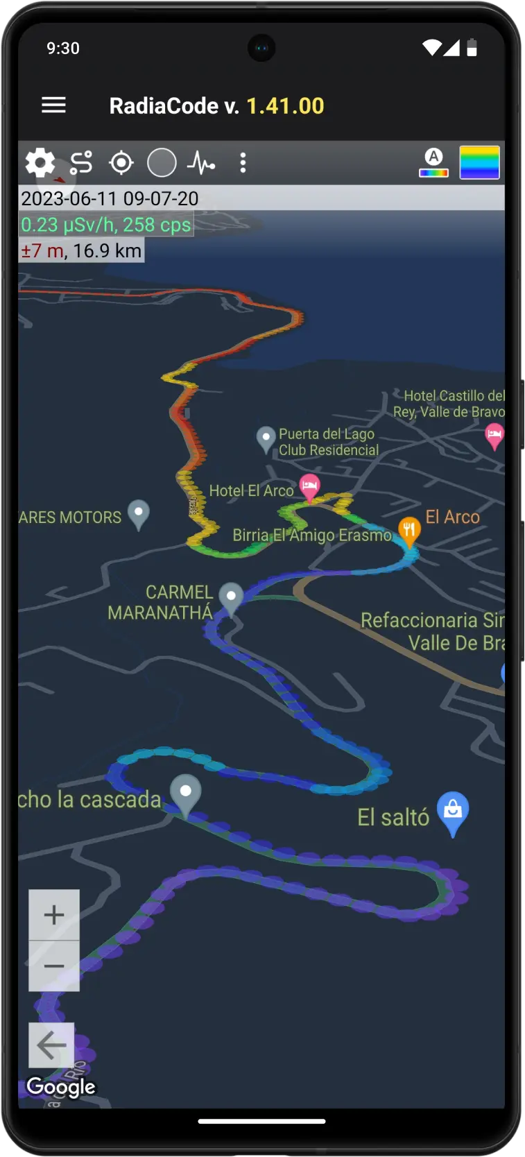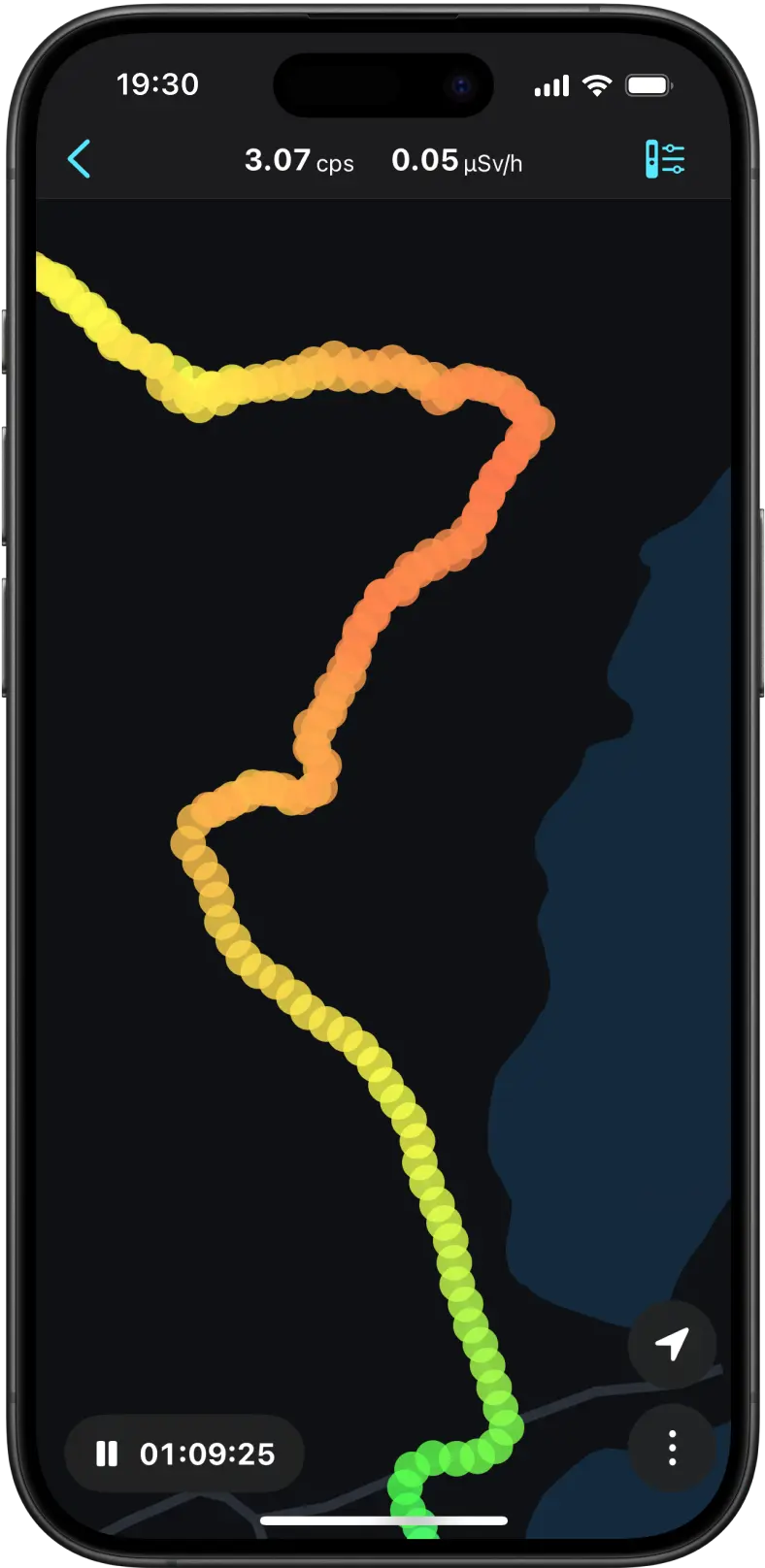 The Radiation Mapping function in Radiacode records radiation measurements on Google Maps, creating a color-coded track that indicates radiation level.