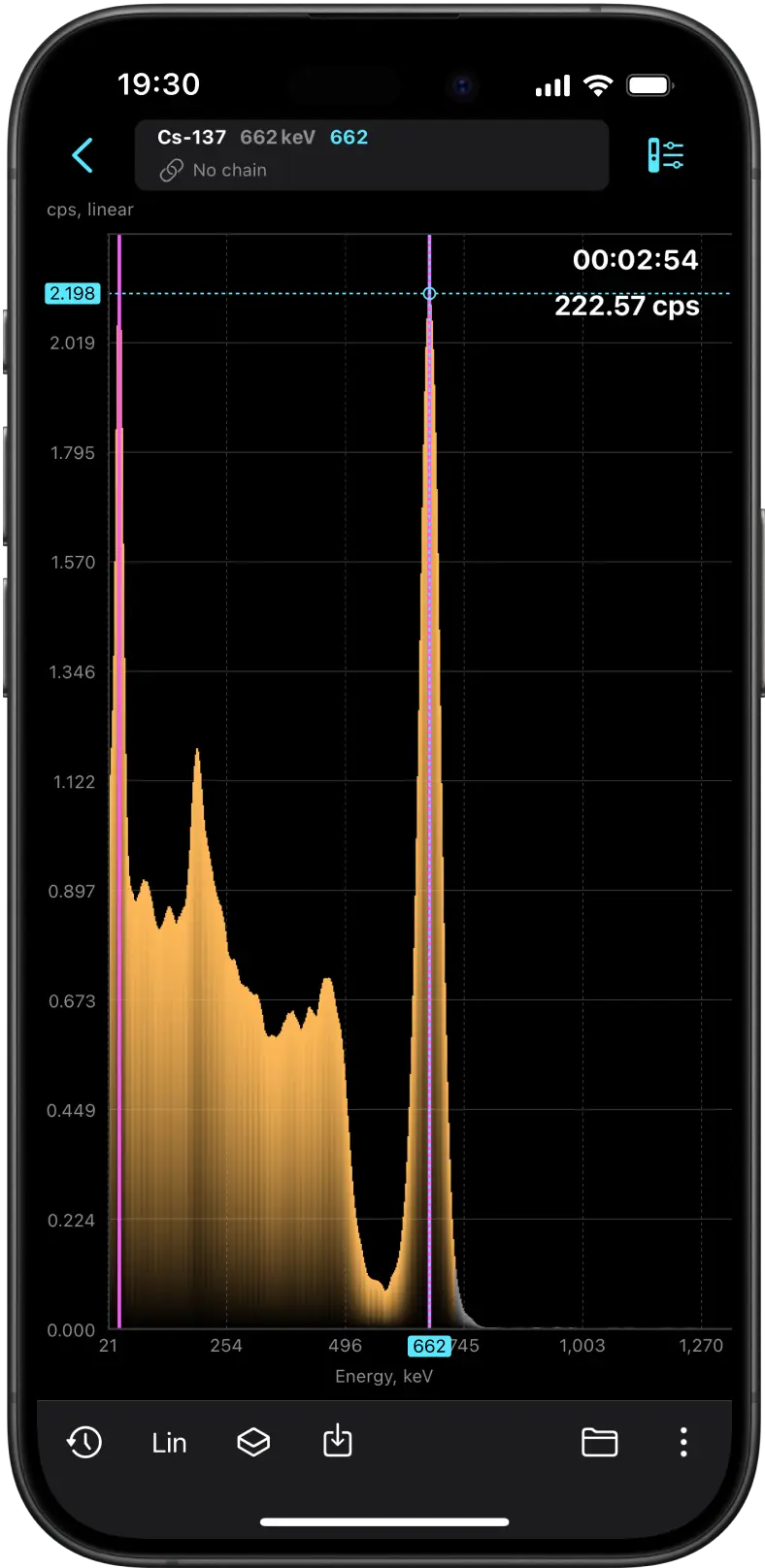 Radiacode includes a specialized mode for detecting Cesium-137 in food products. Cesium-137, a synthetic isotope produced by nuclear tests and accidents, has dispersed worldwide. It does not occur naturally and can be mistakenly absorbed by living organisms.